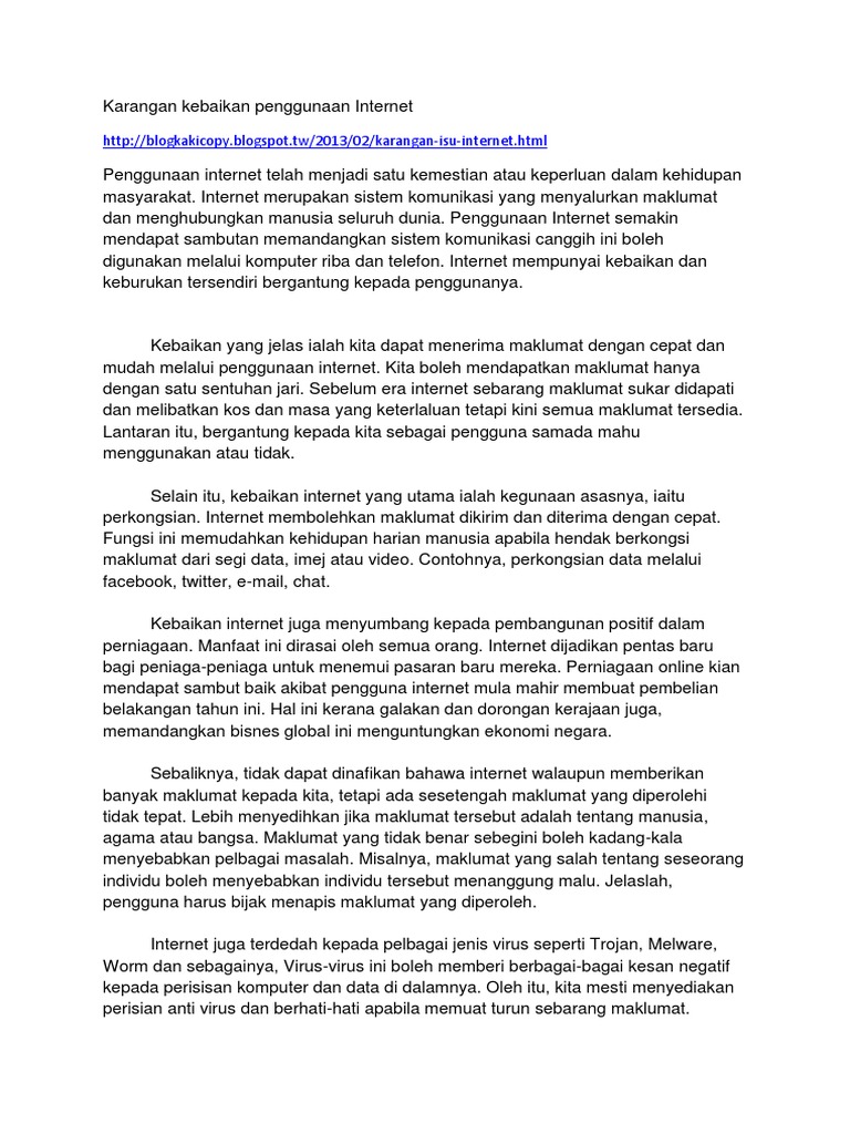 Related : Karangan Kesan Buruk Penggunaan Internet : Penggunaan internet telah menyebabkan penyebaran maklumat menjadi lebih meluas dan murah sehingga memberi pelbagai kesan kepada kehidupan manusia..